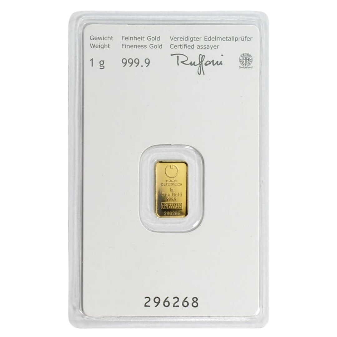 - ✓ Contains 1 gram (0.0321 troy oz) of .9999 fine gold