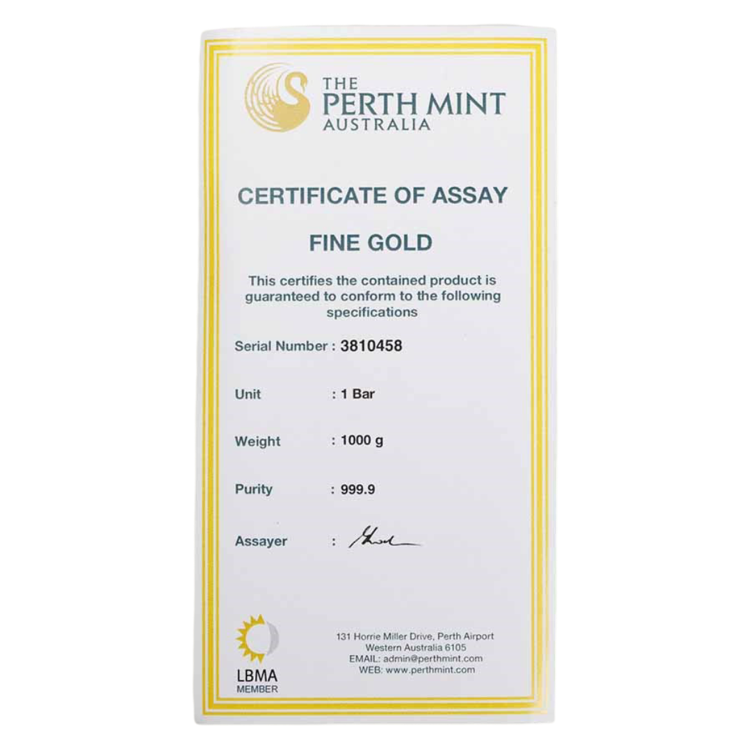 Each bar is accompanied by a certified assay card confirming its weight and authenticity, making it a trusted choice among investors worldwide. With its combination of exceptional purity, refined beauty, and the prestige of The Perth Mint, this kilo gold bar is an excellent option for building or expanding your precious metals portfolio.