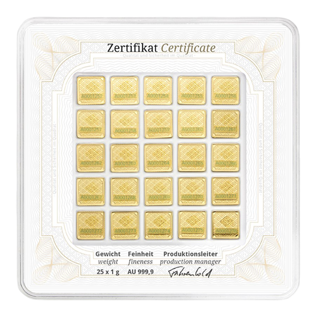 - ✓ Contains 25 grams (0.8038 troy oz) of .9999 fine 24K gold — 25 individual 1 g bars