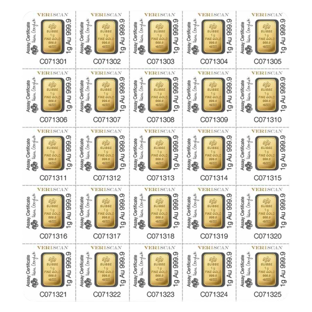 Note: Each PAMP Suisse Multigram+25 set is guaranteed for weight and purity by independent Swiss assayers. Individual 1 g bars can be detached along precision guides without damage to the assay seals.