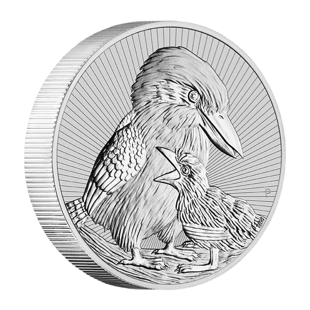 | Reverse: | Mother & baby kookaburra on a branch with radial lines and “P” mint mark |