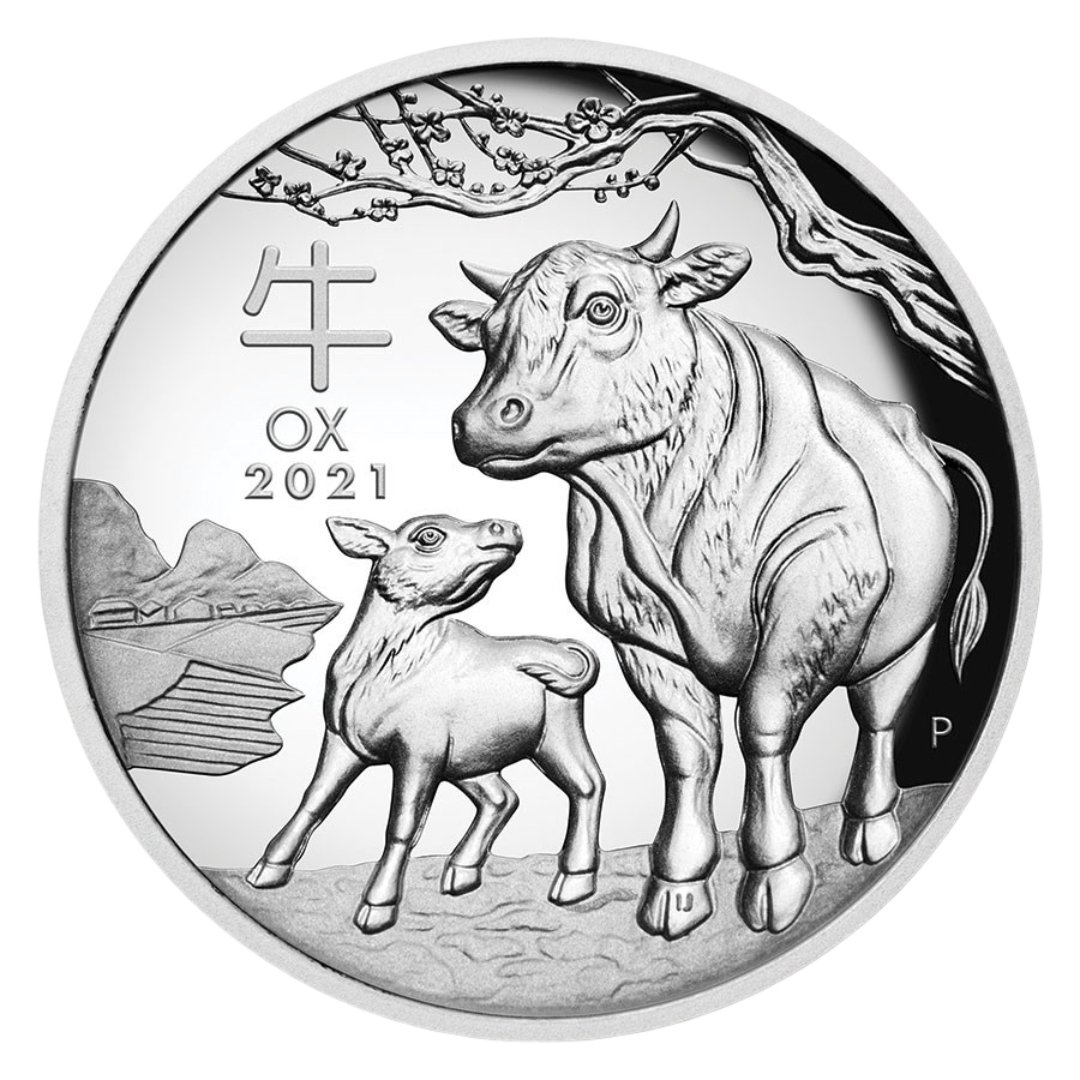 The reverse features a stylized ox and calf, symbolizing strength, reliability, prosperity and family. The design includes the Chinese character for “ox,” the inscription “OX 2021”, and Perth Mint’s famous “P” mint mark.