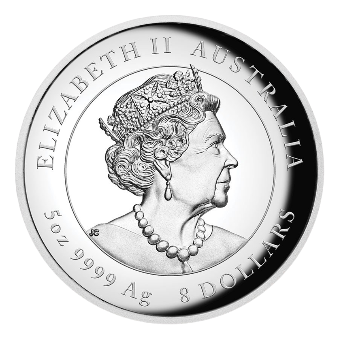 Each coin contains 5 troy ounces of .9999 fine silver and comes preserved in a protective Perth Mint capsule. The obverse showcases the Jody Clark effigy of Queen Elizabeth II, along with inscriptions for the face value, purity, weight and year.
