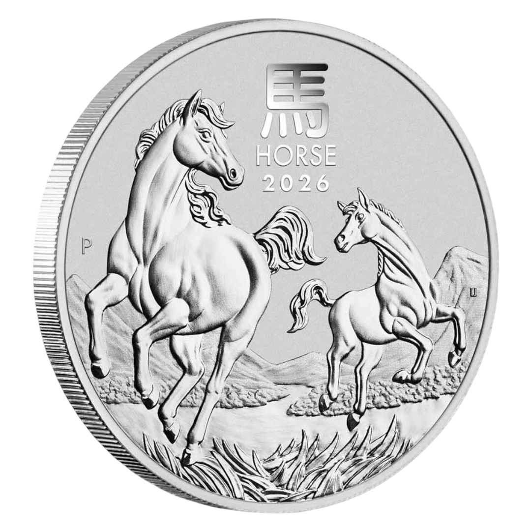 The obverse features the Dan Thorne effigy of His Majesty King Charles III along with the weight, fineness and monetary denomination. The reverse portrays a galloping mare and her foal set against a dramatic backdrop of mountains and grasslands. The design includes the Chinese character for “horse,” the inscription "HORSE 2026" and The Perth Mint’s “P” mint mark.