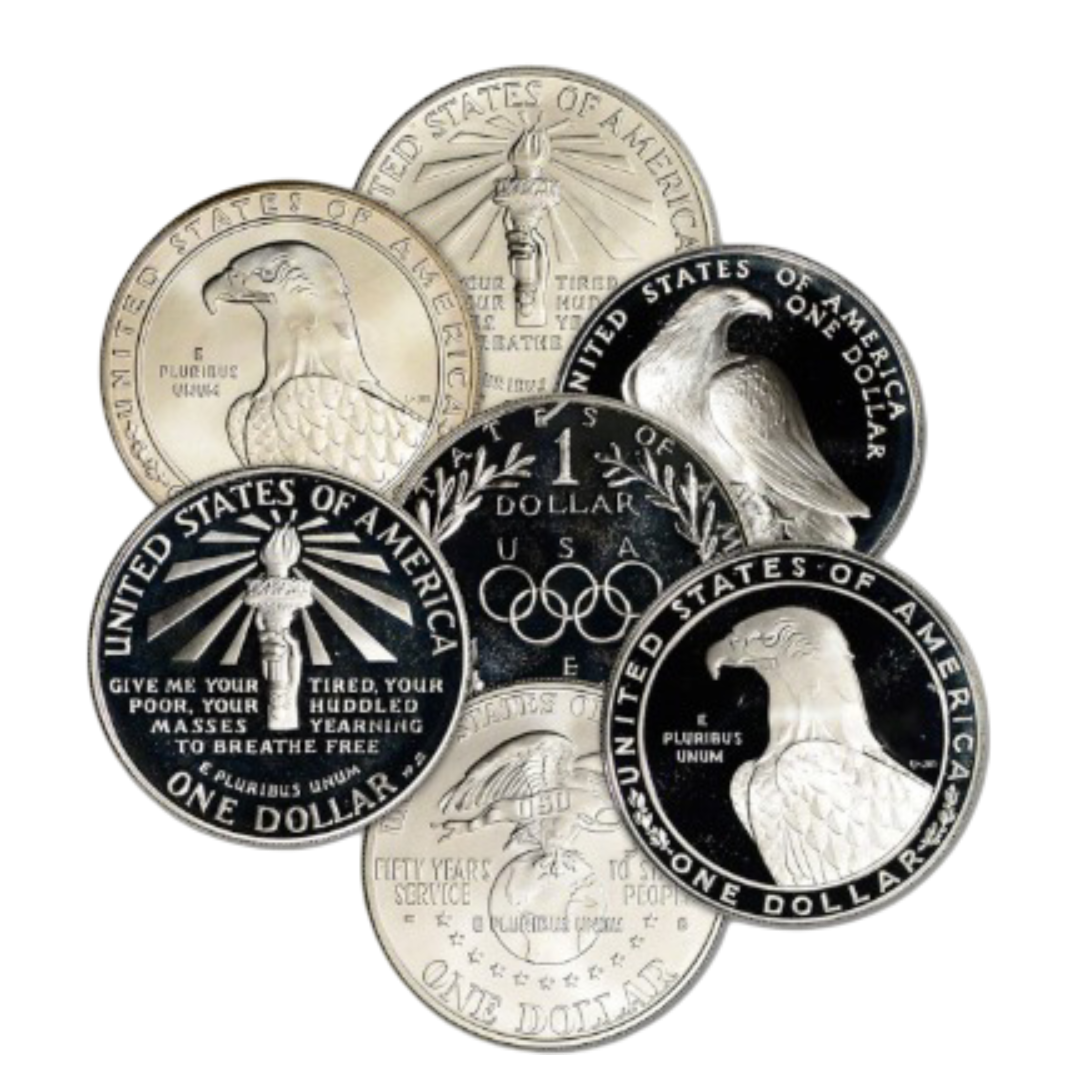 This listing includes random-year BU and Proof coins, mainly from 1983–1991. Past themes include the Olympics, Statue of Liberty, Constitution, Vietnam Veterans, Women in the Military, President Eisenhower, and many more. Each coin is encapsulated for long-term protection.